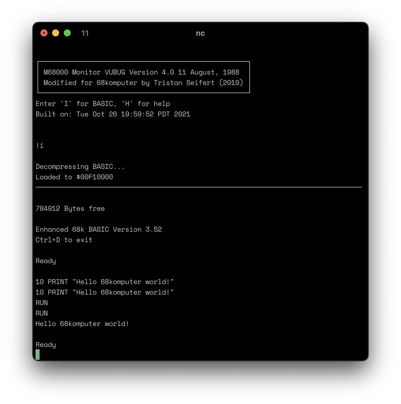 Adding a tiny bit more code around those snippets above, and with the cooperation of all of the required devices, we can execute the binary, and connect to the socket representing UART A, and enjoy some BASIC: