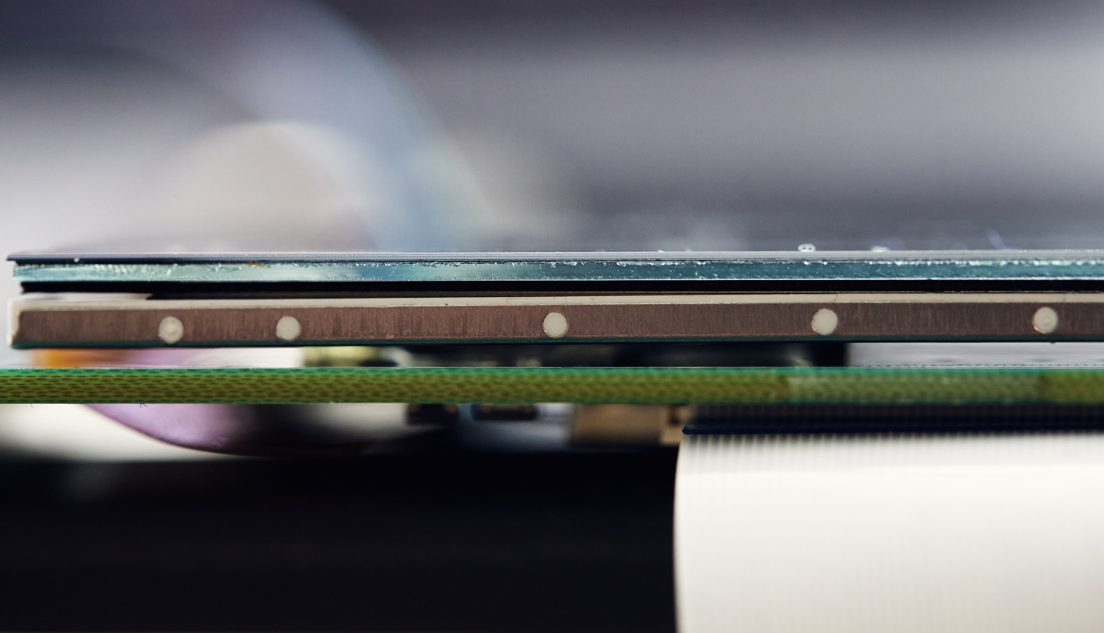 Since height is at a premium on this board (there’s 8mm of clearance between the board surface and the inside face of the front panel,) I integrated the “bare” LCD (rather than using one on an existing PCB carrier) onto the board itself. Above, you can see from top to bottom the touchscreen digitizer, the panel glass, backlight, some out-of-focus double-sided adhesive, and then finally, the PCB.
