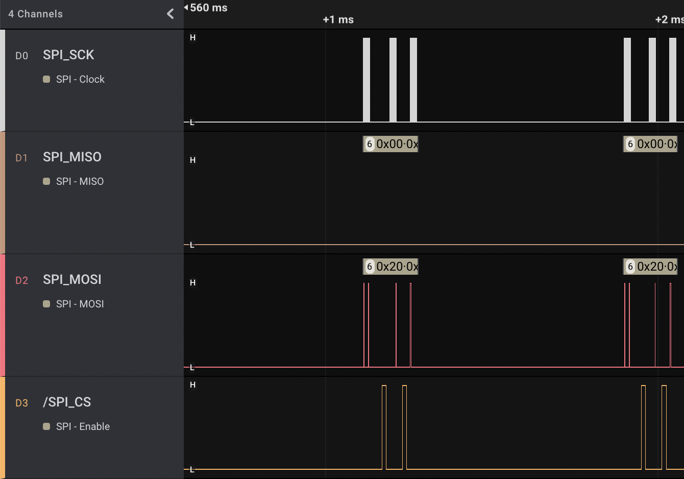 The chip selects are low when they should be… but also at plenty of other times: something is horribly wrong with the SPI driver in the 5.15.y kernel series with the chip select management. I got around this by manually setting the state of the CS line. At some point, I’ll have to debug this issue further. (There’s a good chance there’s a driver changes ST made to the SPI driver that haven’t landed upstream.)