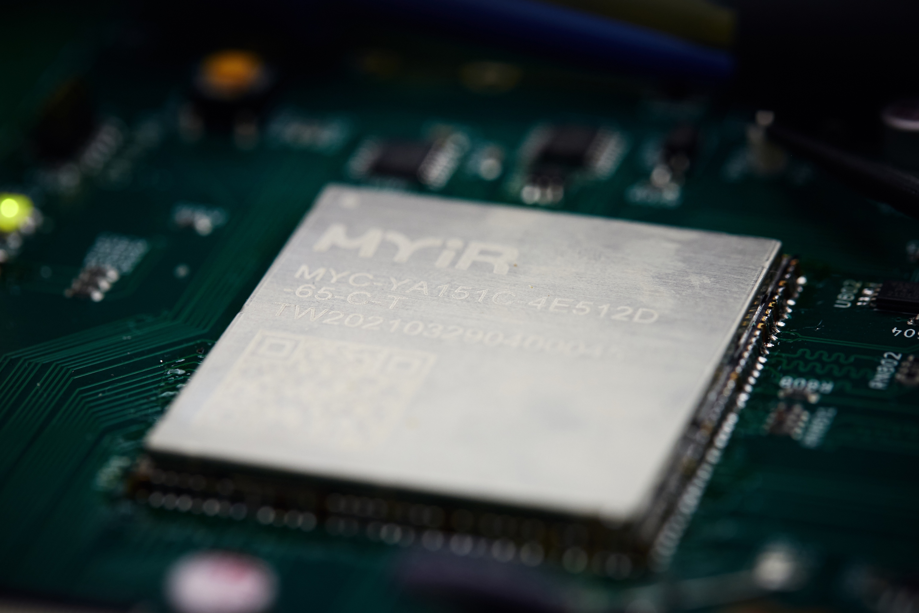 In this case, I went with the MYiR MYC-YA151C-4E512D module. They’re available for about $35 a pop from Mouser, and for that price, pack quite a punch: while they’re based around the most basic member of the product line, the STM32MP151AAC3 (meaning a single 650MHz CPU core, no 3D GPU, and no CAN-FD) they don’t skimp on the peripherals. Included is 512MB of DDR3 533MHz memory and a 4GB eMMC – all in a (reasonably) easy to hand solder 1mm castellated edge package.