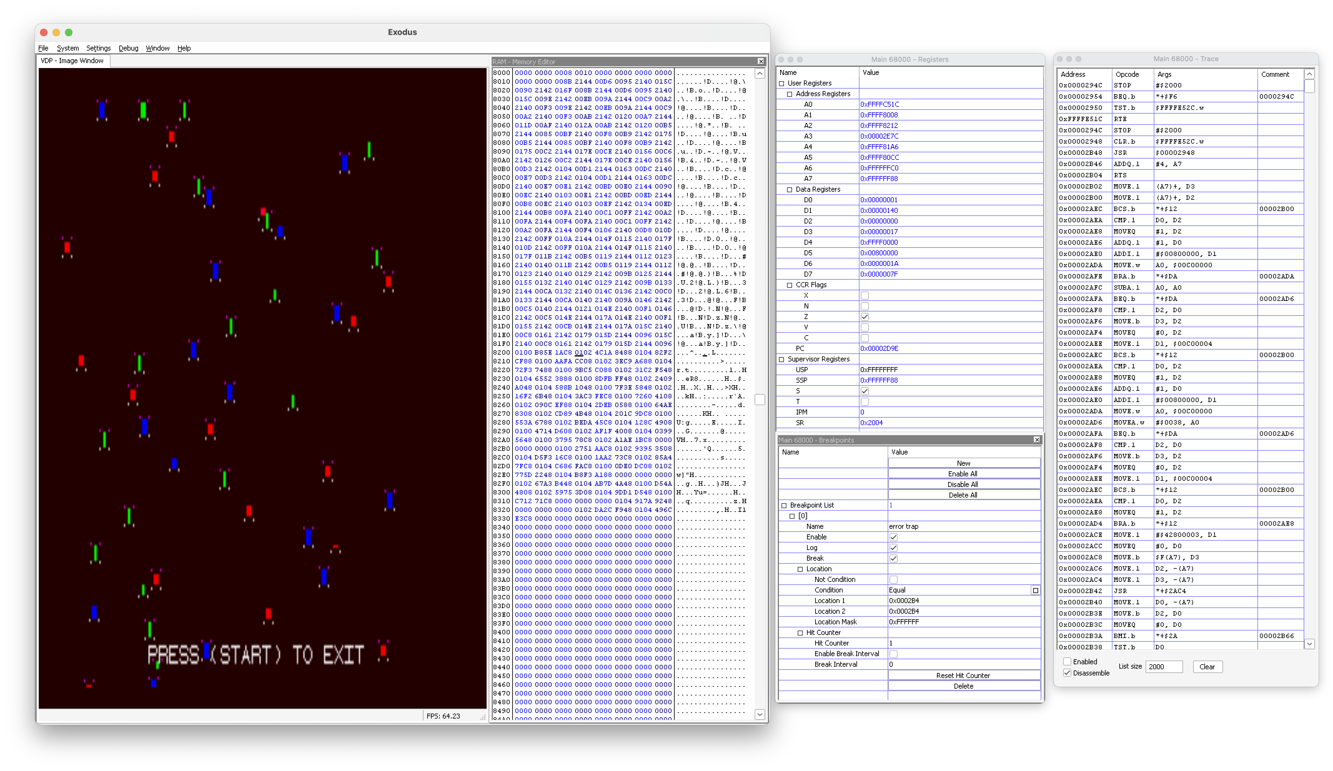 For really involved and heavy debugging, I’ve been using the Exodus emulator in wine. This emulator focuses on accuracy before anything else, so a beefy machine helps: ironically enough, it was borderline unusable under Windows 11 on my Mac Pro, with a 16-core Xeon; but runs just fine on my M1 MacBook Pro6.