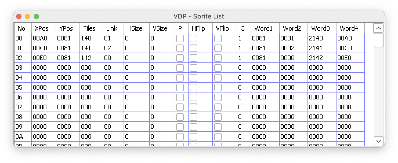 The sprite attribute table is stored in VRAM, and read by the VDP every frame (and during the horizontal blanking period) to render sprites. This table contains the sprite’s screen position, as well as the base palette and pattern index. Each sprite entry occupies 8 bytes in the table, with a maximum of 80 sprites supported.